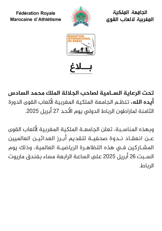 تنظم الجامعة الملكية المغربية لألعاب القوى الدورة السابعة لماراطون الرباط الدولي يوم الأحد 21 أبريل 2024